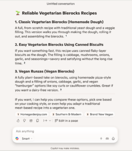 It comes up first in Microsoft Copilot for AI-based snippets or the ‘best vegetarian bierocks recipe’ with a link back to my website, Home Garden Joy. That is pure GOLD in today’s AI-driven search.
